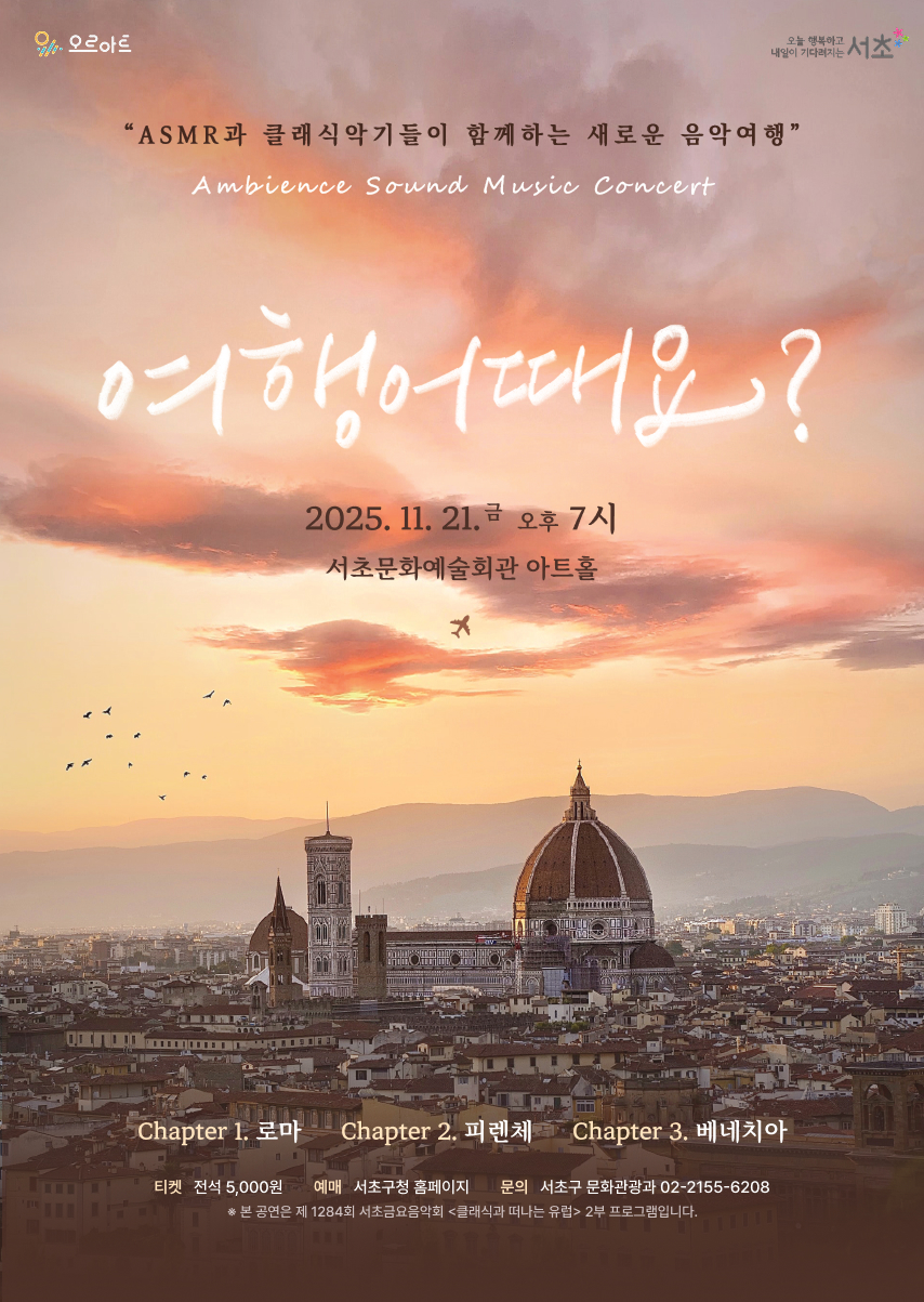 공연소개 "당신의 마음은 어디까지 여행할 수 있나요?" <여행어때요? 이탈리아편>은ASMR과 클래식을 결합해이탈리아를 여행하는 소리여행콘서트입니다. 로마, 피렌체, 베네치아,이탈리아의 세 도시를 여행하며도시가 들려주는 깊고 풍부한 이야기를소리로 경험해보시길 바랍니다. 공연개요 ○ 공연명: 여행어때요? 이탈리아편○ 장르: ASMR MUSIC CONCERT○ 일시: 11/21(금) 19:00(50분) ○ 장소: 서초문화예술회관 아트홀(서울 서초구 강남대로 201) ○ 티켓가: 전석 5,000원(서초구민 2,500원) - ※ 본 공연은 제1284회 서초금요음악회<클래식과 떠나는 유럽> 2부 프로그램으로,기존 90분에서 축약된 50분 버전으로 진행됩니다. ※ 서초금요음악회 전체 공연시간은 120분입니다. ※ 문의: 서초구 문화관광과02-2155-6208 프로그램 Chapter 1. 비행여행자들의 설렘이 시작되는 곳, 공항 Chapter 2. 로마2천 년 역사의 도시에서 만나는 과거와 현재 기사들의 춤 - 프로코피예프옛 성 - 무소르그스키 Chapter 3. 피렌체낭만의 도시에서 순례하듯 따라 걷는 거리 시네마 천국 - 엔니오 모리꼬네크라펜 숲속에서 - 요한 스트라우스 2세달빛 - 드뷔시 Chapter 4. 베네치아축제의 수상도시에서 살아가는 곤돌리어들의 일상 아침의 기분 - 그리그베네치아의 뱃노래 - 멘델스존바카날 - 생상스 Chapter 5. 다시, 일상 출연진 제작사 이런 공연, 또 보고 싶다면?👀▼ 오르아트 채널 바로가기 ▼ (클릭) (클릭)